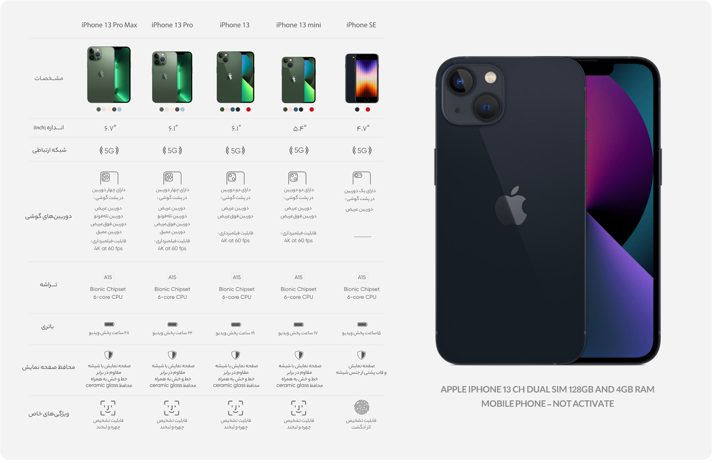 توضیحات محصولگوشی موبایل iPhone 13 CH پرچمدار جدید شرکت اپل است که با چند ویژگی جدید و دوربین دوگانه روانه بازار شده است. نمایشگر آیفون 13 به پنل Super Retina مجهز شده است تا تصاویر بسیار مطلوبی را به کاربر عرضه کند. این نمایشگر رزولوشن بسیار بالایی دارد؛ بهطوریکه در اندازهی 6.1 اینچیاش، حدود 460 پیکسل را در هر اینچ جا داده است. امکان شارژ بیسیم باتری در این گوشی وجود دارد. تشخیص چهره با استفاده از دوربین جلو دیگر ویژگی است که در آیفون جدید اپل به کار گرفته شده است. از نظر سختافزاری این گوشی از تراشهی جدید A15 بهره میبرد که دارای 15 میلیارد ترانزیستور است که دارای کنترل گرمای مطلوبی بوده که تا بتواند علاوه بر کارهای معمول، از قابلیتهای جدید واقعیت مجازی که اپل این روزها روی آن تمرکز خاصی دارد، پشتیبانی کند. به گفته خود شرکت اپل این گوشی دارای سرعتی 50 برابر نسخه 12 خود است. پردازنده دارای ماژولار جدیدی است که مصرف باتری را بسیار پایینتر آورده است و شما دارای حفظ باتری بالاتری هستید. کیفیت نمایش شما در iPhone 13 دارای 120 هرتز است و کیفیت بالایی را شاهد خواهید بود. اپل در این سری از گوشیهای iPhone خود پردازنده گرافیکیای را قرار داده که از سری 12 گوشیهای خود 30 درصد سریعتر است و این نویدبخش آن است که شما میتوانید بازیهایی را با گرافیک و MAP سنگین تر و بزرگتر اجرا کنید. یکی از ویژگیهایی که در iPhone 13 شاهد هستیم سیستم فیلمبرداری ProRes سینمایی آن است که می تواند انقلابی در فیلمبرداری گوشیهای موبایل بهراه انداخته باشد. گوشیهای نات اکتیو با قرار گرفتن سیمکارتهای داخلی اکتیو میشوند و برخلاف مدل اکتیو پلمپ کالا باز نشده است. گوشیهای اکتیو برند اپل هم به این شکل هستند که به دلیل محدودیتهای برخی از محصولات اپل برای کشور ایران، در کشورهای همسایه بهصورت رسمی با یک بار قرار گرفتن سیمکارت، اکتیو شده و پلمپ میشوند و باید بدانید که این پروسه هیچ مشکلی در راستای گارانتی کالا بههمراه ندارد. پارتنامبرهای اروپا و ژاپن و امارات تک سیمکارت هستند و پارتنامبرهای مربوط به امارات هم از فیس تایم پشتیبانی نمیکنند. پارتنامبر JA (ژاپن) هم حتی در حالت سایلنت صدای شاتر عکس قطع نمیشود.